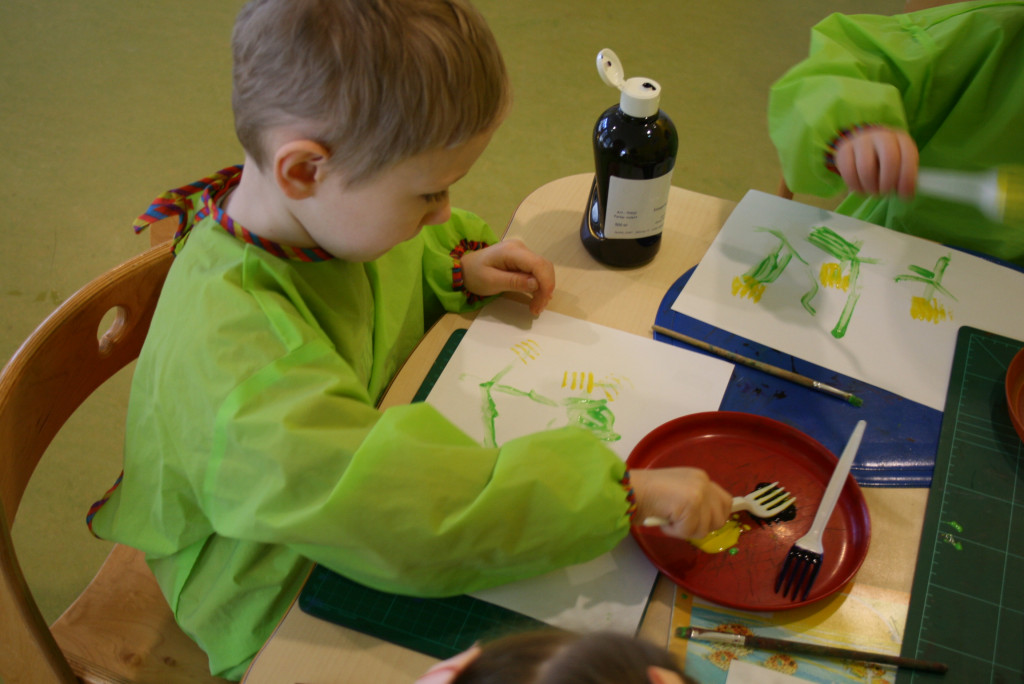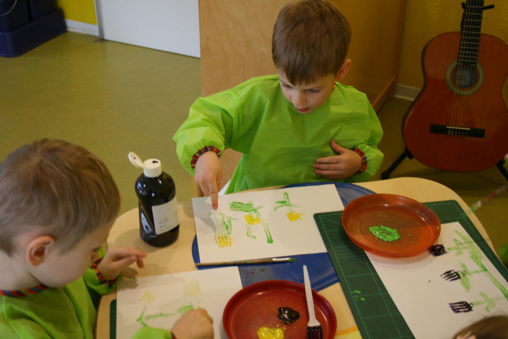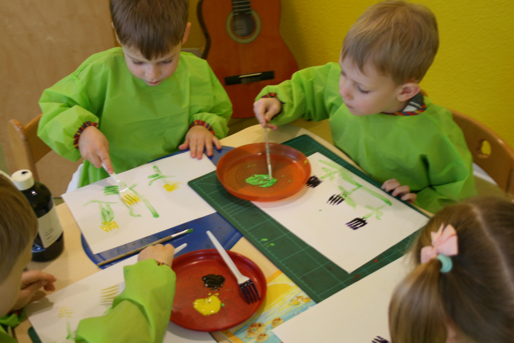 2. Die Kinder tauchen eine Gabel vorsichtig in die Farbe.